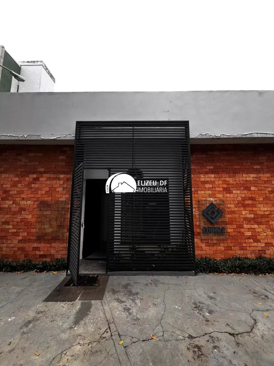 Fachada: Estética industrial moderna com tijolinho aparente e fechamento em grade ripada preta.